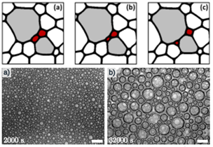 Aqueous foams are dispersions of gas bubbles in a liquid. These out of equilibrium systems will evolve towards disappearance through several ageing mechanism. Surface tension drives the growth of bubble size, as gas diffuses from smaller bubbles to larger ones due to differences in Laplace pressure. As the bubbles grow (or shrink) they will push (or pull) on their neighbours pulling the structure out of equilibrium. At a critical energy the bubbles will rearrange. They change neighbours as shown in the photographs in the top row of the figure below, where the red bubbles shrink and between images b and c the bubbles change places. The resulting dynamics of the bubbles is characteristic of many soft systems (colloidal glasses, concentrated emulsions etc), and still the object of many studies.