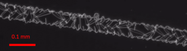 Swelling induced debonding of a grafted poly(dimethylacrylamide) (PDMA) hydrogel film 2 µm in thickness from a preexisting line defect at the interface with the silicon substrate.