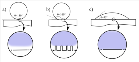 We can decrease the affinity between the liquid and the substrate by patterning. When the liquid sits only on top of the textures (case b), interaction is reduced, and the contact angle increases : this is the principle of superhydrophobic surfaces.