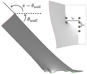 A simulation of a kink like defect. We minimize the energy of the surface as it sits on the surface textures. Gradually increasing the angle θwall, we observe that the surface suddenly jumps to the next post; signaling depinning.