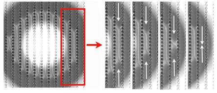 The contact area between a drop and a patterned surface. The triple line recedes through the motion of kink-like defects (white arrows).