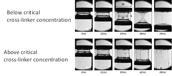 Foams made with complex fluids enables to obtain a very good foam stability, however such foams are usually difficult to produce and process : entrapping air bubbles into viscoelastic materials is not an easy task! We present in this article a way to produce foams from a amphiphilic polymer solution which contains small cross-linking molecules to obtain a viscoelastic foamed gel. We first foam a solution made of a amphiphilic polymer using a mixer. Then we add cross-linker molecules to the foam during the mixing process: these molecules enable to bridge the polymer chains and form the transient polymer gel. We show in our article, to be published in ACS Omega, that the shear stress applied on the bubbles during the mixing process can lead to a complete collapse of the foams once the cross linker molecules are added. We show that the shear induced coalescence of the bubbles is due to the fact that the viscosity of the polymer/cross-linker mixture increases strongly with the shear rate. Consequently the thin liquid films between the bubbles become highly viscous and undergo a viscous to fragile transition : they break as they are stretched during the mixing process. A simple experiment consisting in stretching single thin liquid curved films, named catenoids, enables us to show that when the cross-linker concentration exceeds a critical value, the films break like a fragile material : a fracture propagates in the film and leads to their rupture. Below the critical cross-linker concentration, the films collapse only occurs only when the two curved interfaces meet, which is what is expected for any fluid surfactant film.