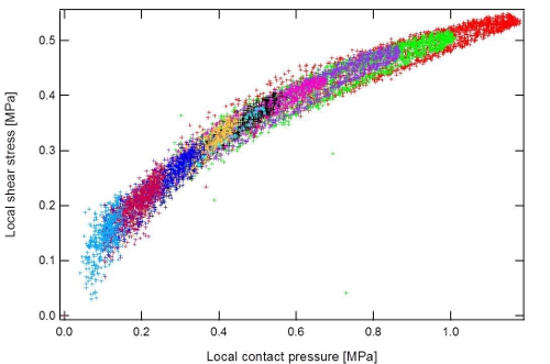 Local friction law within a frictional contact between a smooth silicone rubber and a sand blasted lens (rms roughness about 1 µm). Each color corresponds to a different experiments carried out at increasing normal loads.
