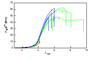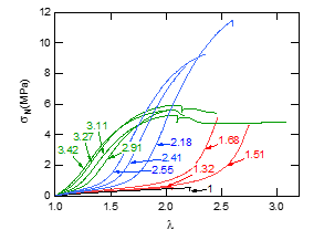 toughness, in particular for moduli above 1 MPa. Our recent discovery of multiple network acrylic elastomers opened a pathway to obtain precisely such a combination. We show here that they can be seen as true molecular composites with a well–cross-linked network acting as a percolating filler embedded in an extensible matrix, so that the stress–strain curves of a family of molecular composite materials made with different volume fractions of the same cross-linked network can be renormalized into a master curve. For low volume fractions (<3%) of cross-linked network, we demonstrate with mechanoluminescence experiments that the elastomer undergoes a strong localized softening due to scission of covalent bonds followed by a stable necking process, a phenomenon never observed before in elastomers. The quantification of the emitted luminescence shows that the damage in the material occurs in two steps, with a first step where random bond breakage occurs in the material accompanied by a moderate level of dissipated energy and a second step where a moderate level of more localized bond scission leads to a much larger level of dissipated energy. This combined use of mechanical macroscopic testing and molecular bond scission data provides unprecedented insight on how tough soft materials can damage and fail.