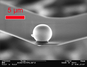 Model silica particle glued to an AFM cantilever for adhesion force measurements in water.To ascertain the nature of this additional short range force, we have used second harmonic generation to demonstrate that there is no UV induced trapping of surface charges. With ambient pressure X-ray photo-electron spectroscopy, we have also shown that UV irradiation does not generate more surface OH groups. This short range repulsive force appears to be intrinsic to the clean TiO2 surface and should therefore be ascribed to surface hydration. In any case, it is certainly a key phenomenon for a strong self-cleaning capacity.