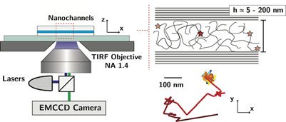 Envisioned experimental methodology. Super-resolution fluorescent microscopy set-up, allowing single-molecule observations of the dynamics of polymeric liquids confined in nanochannels. Few chains are end-tagged with a fluorophore, allowing to track their local dynamics and trajectories.